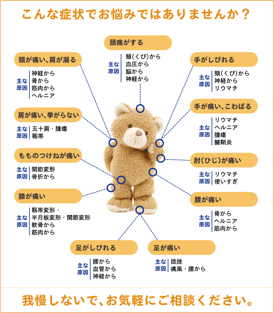 例えば膝の診察に際してタイトなジーンズをはくとか、肩こりの診察に対してハイネックのセーターを着るようなことは控えてください。